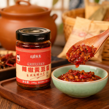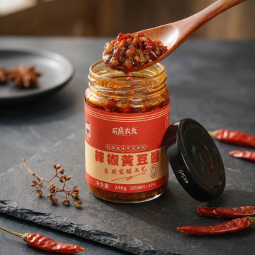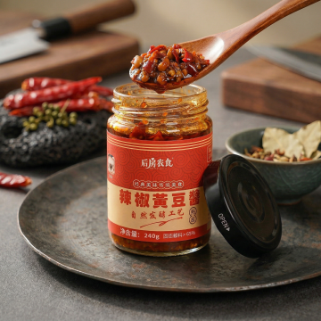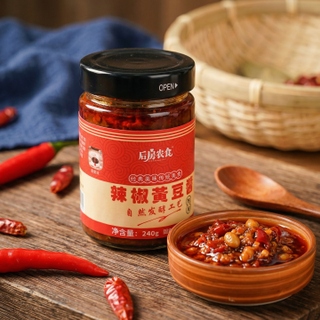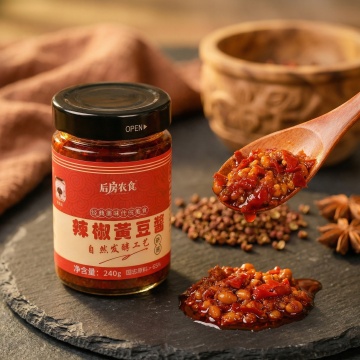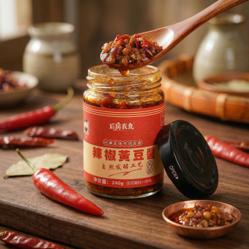 保持酱产品本体完全不变,产品包装形状、结构、图案、文字均不修改,保留酱料原有颜色、颗粒和质感,更换为和之前所有生成结果都完全不同的全新场景,保持暖色调自然光,柔和侧光,红油油润反光,辣椒鲜亮,微距特写,浅景深,浓郁酱香,干净高级,美食商业摄影质感,超有食欲