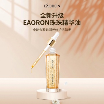 红金3D促销风设计,透明精华液瓶与灯笼元宝等年货元素结合,营造热闹年货节促销氛围