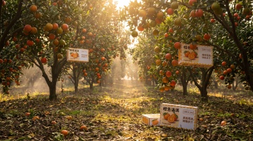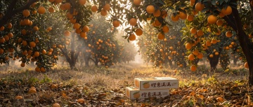 户外果园自然写实场景,将两个橙子包装盒放在前景,阳光午后柔和自然光,背景是成片翠绿橙树林,枝头挂满新鲜成熟橙子,橙子带翠绿新鲜枝叶,果皮鲜亮完整,天然果粉层次分明;地面散落少量新鲜落叶,空气通透朦胧感,逆光光影勾勒水果轮廓,写实微距细节,8K 超清,色彩自然原生,生鲜自然健康调性,治愈田园风,画面真实无滤镜