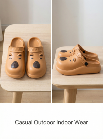 [Image 5] Side multi-angle display of khaki bear hole-free clogs, fashion casual style, light solid wood table background, soft natural light. Two pairs of shoes are placed at 45 degrees to show the thickened soft sole and adjustable strap design from the side, highlighting the lightweight and comfortable features. Add the English selling point text "Thickened Sole | Adjustable Strap" on the upper right, text color is brown, keep the picture clean and layered, product appearance consistent with the reference.