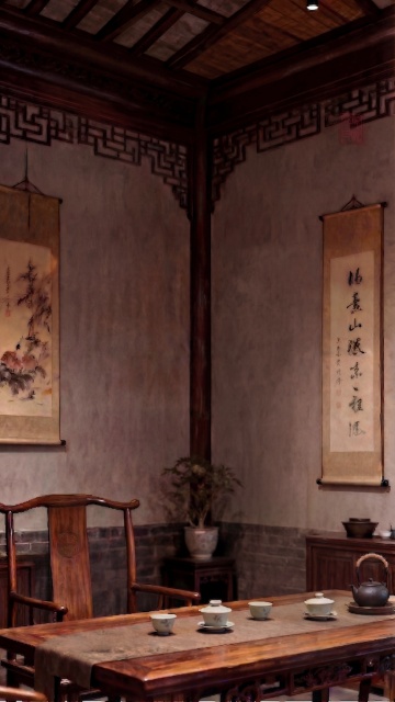 一张木纹桌面上,右侧放置着一个黑色镂空雕花屏风,屏风后有一盆绿色盆景,背景是柔和的暖黄色调,光线从左上角斜射过来,在粗糙质感的墙面上投下斑驳的光影,营造出宁静而古朴的氛围,环境变换为传统中式书房的角落,光线柔和温馨,整体风格统一且具有古典韵味。