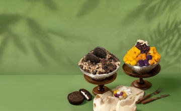 色彩鲜艳的写实风格冰淇淋球组合,透明雕花玻璃高脚杯盛放,三个不同口味的冰淇淋球堆叠:深棕色巧克力口味带细腻波纹,白色香草口味点缀黑色巧克力碎,浅棕色香草口味顶部装饰黑色几何图案巧克力片,右侧有螺旋状奶油,杯壁内侧底部有彩色水果丁(红色樱桃、黄色芒果块),两根棕色酥脆蛋筒斜插在冰淇淋球后方,整体光影明亮柔和,高光突出冰淇淋的丝滑质感和玻璃的透明光泽,色彩饱和度高且对比鲜明,构图饱满居中,背景为纯白色。