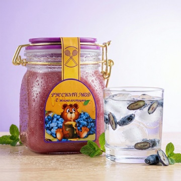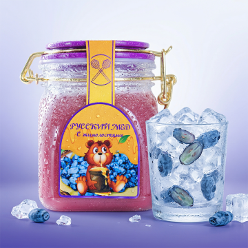 将蓝靛果水果口味饮品瓶身挂满冷凝水珠,旁边放置玻璃杯中加入冰块与水果片,背景改为浅紫到白色的清新渐变,添加自然冷光,让画面清凉通透,新鲜感强,写实风格,突出冰镇爽口卖点,做成电商主图