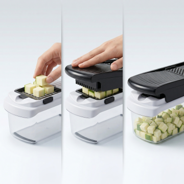 Ultra realistic close-up product image,主体手动蔬菜切碎器保持原有产品设计结构不变,黑白色机身搭配透明容器,强制保留所有原有产品组件。特写展示内置透明容器,新鲜切好的黄瓜丁、胡萝卜丁和洋葱丁整齐收集在容器内,产品放置在明亮干净厨房台面上,上盖微微打开以展示切割结构,刀网和透明容器细节清晰锐利,现代电商广告风格,柔和摄影棚灯光,超逼真产品摄影,清洁电商风格,现代美式厨房美学,柔和自然采光,高细节,清晰对焦,真实材质,准确比例,和参考产品设计一致,无Logo,无水印,无额外配件,不变形,产品完整不裁剪,无文字。保持产品主体物理结构不变,透明度控制正确。商业高调摄影,柔和轮廓光突出透明容器质感,前中后景层次分明,特写构图聚焦容器部分。