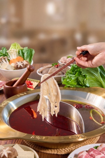 重拟物风呈现热辣沸腾的中式火锅,油光溢彩,蒸汽缭绕,辣椒与牛肚在光影中跃动,质朴木桌衬托实景感,如油画般浓郁。