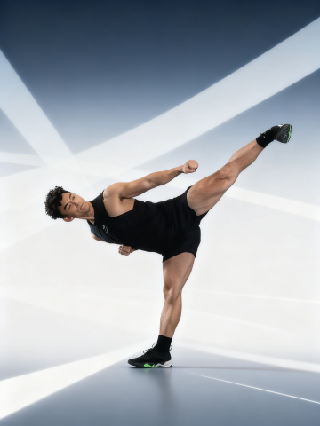 光影交错中跃动的肌肉线条,3D质感强化体积感,现代工业风背景衬托热血励志瞬间,实景拍摄呈现极致力量与动感。
