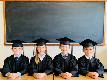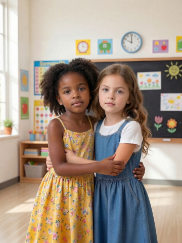 把第二张图里的粉色纱巾分别系在第一张图两个女孩的脖子上,保留原图两个小女孩拥抱的姿势、教室背景和她们的穿着装扮,自然真实,不改变整体风格
