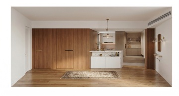 超写实室内家居商业实拍照片,8K 超清分辨率,极致真实的摄影级质感,斜 45 度侧视平视构图,轻微自然广角透视无畸变,焦点清晰覆盖整个 L 型一体式定制柜体,自然适中景深,画面干净整洁无多余杂物,主体突出,呈现现代中古风融合轻法式轻奢的入户玄关一体式通顶鞋帽柜家居场景,整体为现代家居入户过渡空间,柜体为 L 型一体化设计,分为左侧换鞋凳区与右侧储物展示区两大模块,整体采用带有细腻自然纹理的深胡桃木哑光木饰面,无反光高光,风格统一协调;左侧换鞋凳区上方为双开门封闭吊柜,与整体同材质同色,吊柜下方嵌入式安装暖白色线性氛围灯带,采用见光不见灯的设计,灯光柔和均匀打亮下方挂衣区,挂衣区墙面为暖白色哑光乳胶漆,安装深棕色实木挂衣杆,搭配 5 个黑色哑光金属挂钩,挂钩下方设置同木色换鞋凳,凳面为米白色柔软软包坐垫,换鞋凳底部留空做开放式鞋区,底部同样嵌入式安装暖光氛围灯带,鞋区内自然摆放几双日常家居拖鞋与皮鞋,还原真实居家场景;右侧主柜体为一门到顶的一体化设计,上半部分为双开门封闭储物柜门,极简平板无造型设计,下方衔接双层开放式置物格,每层置物格的层板下方均嵌入式安装暖白色线性氛围灯带,均匀照亮置物格内部,置物格内摆放透明玻璃器皿、两个带玻璃盖的透明密封罐,罐内装有黄色干果零食,同时搭配食品包装盒、透明玻璃密封罐、白色简约装饰书盒,软装搭配精致和谐;置物格下方为通长的纯黑色哑光岩板台面,质感细腻无反光,台面上摆放透明玻璃醒酒器、配套玻璃杯与金属托盘、白色咖啡杯碟、小份点心,一旁放置透明玻璃花瓶,瓶内插有一支枝叶舒展的绿色蕨类绿植,形态自然生动;岩板台面下方为两列并排的奶白色哑光烤漆平板抽屉,每列 3 个共 6 个抽屉,每个抽屉正中均安装一枚圆形哑光黄铜金属拉手,与整体轻奢风格统一,柜体最右侧延伸出同木色的通顶封闭柜门,整体无多余收口条,门缝极窄,极简高级;地面通铺大尺寸浅灰色哑光瓷砖,采用同色系美缝处理,瓷砖缝隙极细,整体感极强,地面带有柔和自然的光影反射,还原真实地面质感;顶面为极简悬浮吊顶,无主灯设计,顶面为暖白色哑光乳胶漆,安装嵌入式圆形防眩射灯,光线柔和不刺眼,空间阴角线条干净利落,非木饰面覆盖的墙面均为暖白色哑光乳胶漆,与木色柜体形成柔和过渡;整体采用柔和的暖调自然光,搭配柜体多处嵌入式灯带的暖光氛围照明,光影过渡自然柔和,明暗层次丰富,无生硬死黑阴影,整体色彩色调为低饱和度暖色系,以深胡桃木暖棕色为基底,搭配奶白色、纯黑色,以哑光黄铜金色作为轻奢点缀,色彩和谐统一,高级感拉满,画面极致还原真实材质质感,木饰面的自然细腻纹理、金属的哑光细腻质感、玻璃的通透质感、岩板的细腻肌理、烤漆的温润质感、软包的柔软质感、鞋履的真实材质都精准呈现,整体氛围温馨雅致,简约高级,兼具实用性与美观性,充满居家烟火气又不失质感的现代家居入户空间