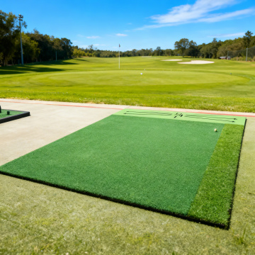 产品为高尔夫绒布轨迹果岭短草打击垫,请根据该产品定位生成相应的场景,有人在旁边挥杆打球