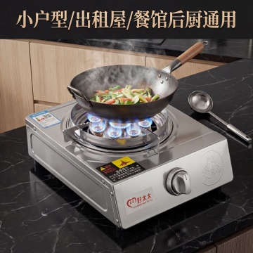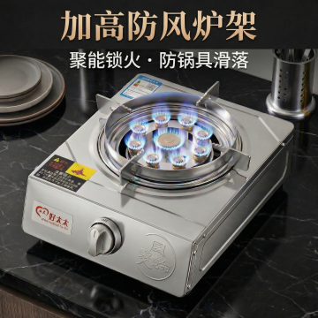 家用液化气单灶,不锈钢机身,保留原图产品所有细节、品牌贴标和警告标签,九头纯铜火盖正燃烧蓝色火焰,45°侧俯新角度,背景为黑色大理石台面,搭配浅灰色陶瓷盘、银色金属筷筒、橄榄油瓶等厨房摆件,与参考图同色系但位置错落,顶部用金色复古宋体写"5台起批,支持混批",底部深色功能栏配白色图标+文字:"5.0KW大功率"、"9头纯铜火盖"、"骏业电磁阀"、"国标熄火保护",暖调打光突出金属质感,无水印,高清商用图,背景是黑色大理石台面,配色保持不锈钢银+火焰蓝+深黑+金色,标题金色复古宋体,正文白色无衬线体