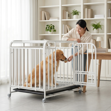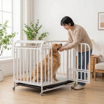 保持白色不锈钢狗笼物理结构绝对不变,狗笼放置在阳光阳台的浅原木地面上,狗笼里面坐着一只金毛犬,一个东亚面孔的小女孩站在狗笼旁边拿玩具逗狗玩,整体氛围是家庭小清新风格,全屋漫射柔光,低对比度,阴影极淡柔和,画面明亮干净,色调为暖白低饱和度,营造温馨治愈感,背景是阳台护栏和远处城市景观,旁边放着一个木质花架和几盆绿植,阳光透过纱帘洒入,商业摄影,4K超清,通透干净。