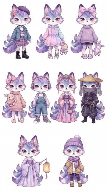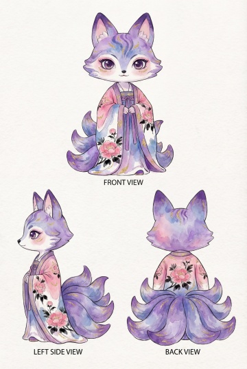 参考这张图片的九尾狐形象,生成纯正面视角的扁平手绘插画,保留原设计的紫色九尾、水墨纹理、浅金细闪和海棠团花唐朝披风元素