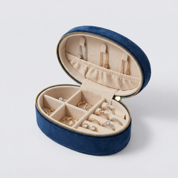 参考提供的图片,生成椭圆形韩国绒首饰收纳盒电商详情页,展示打开状态的产品,体现内部分区收纳结构,绒面材质质感,方便放置戒指项链等首饰,突出便携精致特点,简洁浅色背景,高清商业摄影