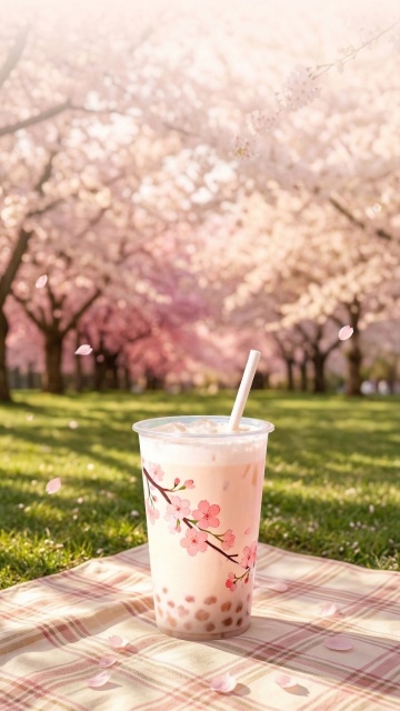 商业海报,春日奶茶店促销,清新治愈风格。主色调为浅紫色、浅粉色、浅绿色柔和渐变。画面包含飘落的樱花花瓣,点缀樱花枝与奶茶杯。排版简约,留白充足,层次清晰。主标题"春日限定买一送一",用优雅圆润的中文艺术字突出显示。副标题"全场第二杯半价",字号较小,置于主标题下方。整体氛围温柔明亮,高清画质,适合商用印刷