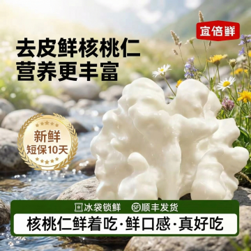 参考这张图片,生成一张类似的去皮鲜核桃仁产品宣传图,换一个真实且风格不同的全新背景,不要和原图绿色背景相似,保留排版结构、所有文案内容、堆叠核桃仁在岩石上的展示,核桃仁保持奶白色,整体尺寸750x750