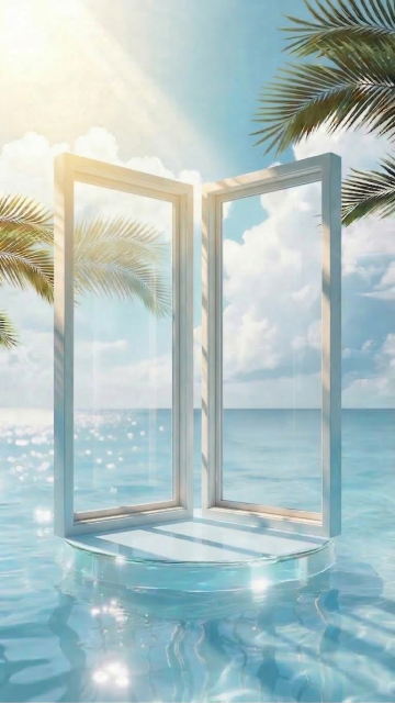 超写实摄影风格,明亮通透的夏日氛围,纯净的渐变蓝色天空点缀着蓬松的白色积云,波光粼粼的广阔海面呈现从浅蓝到深蓝的自然过渡,海水清澈见底,可见细密的水波荡漾,阳光在水面洒下耀眼的金色光斑,画面右下角可见部分细腻柔软的白色沙滩,沙滩上有清晰的棕榈叶阴影,左上角和右上角各有几片翠绿的棕榈叶自然垂落形成边框,整体构图开阔舒展,色彩清新明快,光影对比强烈,营造出宁静惬意的热带海滨景象。