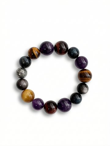 融合紫水晶、虎眼石与金属雕花珠,呈现优雅奢华的现代静谧感,光影流转间透出神秘金属风。