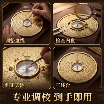 [画面元素] 四格拼图展示三线合一操作步骤,每格展示一个操作步骤:1调整盘线、2检查内盘、3纠正天池、4三线合一,每格清晰展示对应操作画面,保持罗盘红色主体,光影统一,四个格子均匀分布在画面中