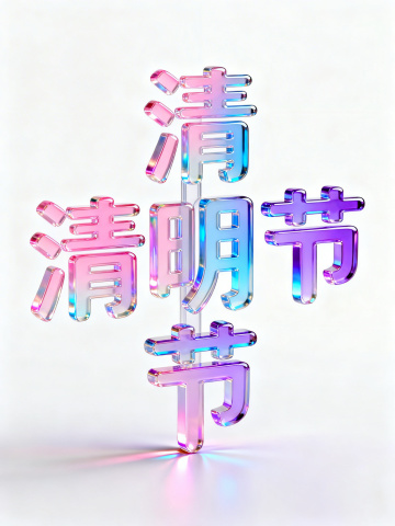 未来感与科技感交织,3D玻璃风字体呈现梦幻清透质感,重拟物设计赋予“清明节”立体体积感,虚拟现实美学点亮传统节日。