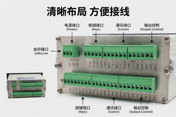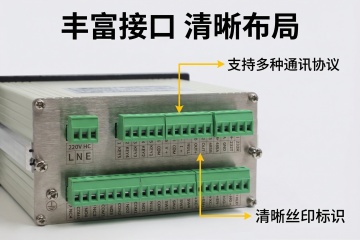 [主图3] 功能卖点展示,左侧放置控制仪表产品整体图,右侧分点列出三大核心卖点:支持MODBUS兼容通讯协议、多功能按键操作、清晰指示显示屏。背景采用浅灰渐变,主标题文案 "专业设计 功能齐全",文字大小层级分明,不遮挡主体,整体采用左右拼图布局,清晰传递产品核心优势,风格保持专业统一。