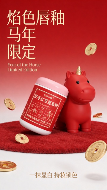 商业摄影,极简主义电商海报。画面中心是参考图靠在磨砂卡通胖胖可爱的红色小马雕塑上。背景是红色渐变,下方为红色绒面地毯,周围漂浮着金色的铜钱硬币。左边大号优雅金色纤细字体"焰色唇釉 马年 限定",现代无衬线黑体,字体有起伏的节奏;下方搭配小号优雅衬线体"Year of the Horse Limited Edition"。底部居中有一行优雅小字:“一抹显白 持妆锁色”。整体排版呈现杂志风格,留白透气,文字颜色为淡金色,层级分明,具有高级平面设计感。高质量,柔和的演播室灯光,3D渲染,细腻的材质,节日氛围。