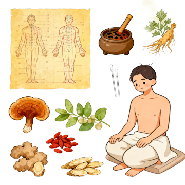 六个系列的中药元素集合,每个元素都采用复古手绘插画风格,以米色为纯色背景,包含以下不同内容:1. 左侧:一本打开的古旧草药书,书页上放着几支人参和灵芝,旁边散落着几颗黄色的药丸;右侧:一个棕色陶罐,里面插着几支干枯的艾草,罐口系着麻绳。2. 左侧:一个竹编簸箕,里面装满了晒干的金银花和菊花,旁边放着一个小铜秤;右侧:一张卷起来的草药图谱,用红绳系着,旁边散落着几片银杏叶。3. 左侧:一个青花瓷碗,碗里盛着当归和枸杞,旁边放着一把小银勺;右侧:一棵手绘的草药植株,根部带着泥土,叶片翠绿,旁边有几颗红色的果实。4. 左侧:一个木质药柜抽屉,抽屉上贴着“川芎”的标签,里面露出几支川芎根茎;右侧:一个玻璃药瓶,里面装着黑色的药膏,瓶口用软木塞封着,旁边放着一支小毛刷。5. 左侧:一张手绘的人体经络图,图上用红线标出穴位,旁边放着几根银针;右侧:一个小竹篮,里面装着薄荷和藿香,篮子把手处系着蓝色布条。6. 左侧:一个铜制药炉,炉口冒着热气,旁边放着一把蒲扇;右侧:一张写着草药配方的泛黄纸张,纸上放着几支甘草和黄芪,旁边散落着几颗褐色的种子。所有元素排布规整,线条细腻,色彩以棕色、绿色、红色为主,呈现出古朴自然的氛围,无任何文字、LOGO、电话地址及二维码。