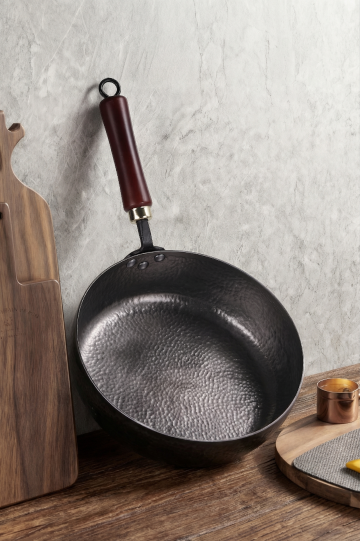 现代工业风厨房中,中式炒锅翻炒香辣蟹,金属质感与光影交织,重拟物设计凸显科技感与商务气息。