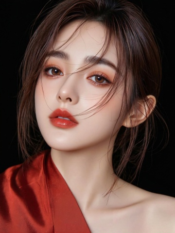 女性侧脸特写,柔和侧光,浅灰色背景,光滑细腻的肌肤质地,黑色抹胸礼服,保持头发主题,变换为棕色波浪卷发,发丝蓬松有层次,发尾微卷,光泽感强,整体画面简约干净,突出发型与发质的精致感。