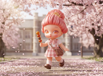 软3D风国潮娃娃,融合中式美学与梦幻色彩,樱花发饰点缀温柔面容,背景山水意境悠远,尽显可爱与唯美感。