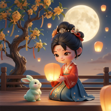 古典中式风格,卡通软3D设计,人物身着汉服,手持团扇,背景为传统园林。