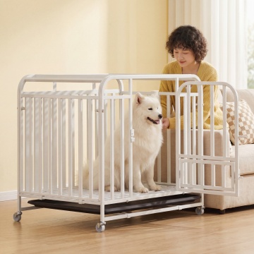 保持白色不锈钢狗笼物理结构绝对不变,狗笼放置在奶油风儿童房的奶白色地毯上,狗笼里面坐着一只边牧犬,一个东亚面孔的小孩子站在狗笼旁边逗狗玩,整体氛围是家庭小清新风格,全屋漫射柔光,低对比度,阴影极淡柔和,画面明亮干净,色调为暖白低饱和度,营造温馨治愈感,背景是浅色儿童衣柜和卡通墙面装饰,旁边散落着几个彩色宠物玩具,柔和自然光从窗户照入,商业摄影,4K超清,通透干净。