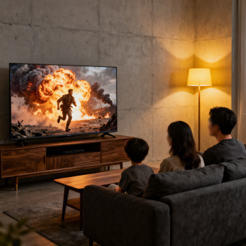 一个现代简约风格的客厅场景,阳光透过巨大的落地窗洒入,木地板泛着温暖的光泽,浅灰色的布艺单人沙发搭配黑色皮质脚凳,原木色的电视柜上放置着一台超薄智能电视,电视屏幕上显示着一个宁静的湖泊日落景色,湖面上有一艘小船,远处是连绵的山峦和橙红色的晚霞,天空中飘着几朵云彩,电视下方的应用图标清晰可见,电视柜上摆放着两个简约的黑色陶瓷花瓶,窗外可以看到城市的远景和山脉轮廓,整体氛围明亮、通透、舒适,具有高度的真实感和细腻的光影表现,光线从画面右侧窗户射入,在地面和家具上形成柔和的阴影和高光,色彩以原木色、灰色、白色为主调,搭配屏幕上日落的暖色调,构成和谐统一的现代家居美感。