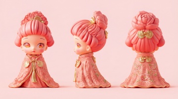 基于这个山茶妖IP形象,生成整合在一张图里的三视图,包含正面、侧面、背面三个视角,保持扁平手绘风格,保留粉色山茶发髻、金色花纹和胭脂红色明制披风的设计,干净排版,同一浅粉色背景
