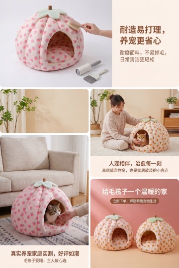 [文字版式] 主标题“户外防水 四季猫窝”,左上角悬浮;副标题“可拆卸组装 耐抓耐咬”,字号小于主标题50%,在主标题下方;右上角胶囊标签“网红款”,字色采用深棕色,无衬线粗体;保持画面呼吸感,不遮挡主体
