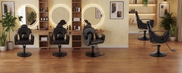 将图中的黑色软包皮革黑金理发椅,放置在高端轻奢美发沙龙的剪发造型区中,空间为现代极简风结合侘寂轻奢风,参考设计师Amjad Salloum的柔和质感室内设计。包含3组造型工位家具,白色哑光工作台、嵌入式拱形全身镜,壁龛式置物架摆放整齐洗护产品,台面上放置美发工具。灯具为线性玫瑰金轨道吊灯搭配磨砂球形灯罩,带隐藏式灯带。墙面为微水泥艺术涂料哑光肌理,地面为哑光无缝材质,主色调为米白、奶油白、浅暖杏色,点缀玫瑰金与香槟金,整体为低饱和暖调。采用平视广角镜头,对称式布局,画面完整呈现空间延伸感,镜像反射强化空间纵深感。8K超写实渲染,高清质感,柔和环境阴影,无杂物无人物,纯空间呈现,突出材质氛围。漫射自然光搭配隐藏灯带暖光,整体亮度均匀光线柔和,干净通透静谧高级