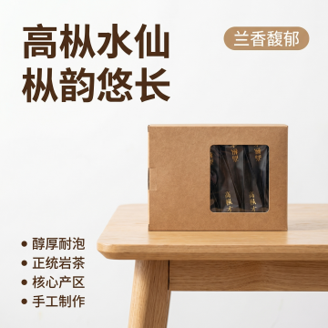画面元素:保持原包装牛皮纸盒开窗设计,打开包装盒展示盒内的独立泡袋,泡袋样式必须和原图保持一致:黑色泡袋,带有金色“高枞水仙”字样,泡袋斜放排列在盒内,不取出泡袋,完整展示原包装内部结构,背景为干净原木茶台,光线柔和自然