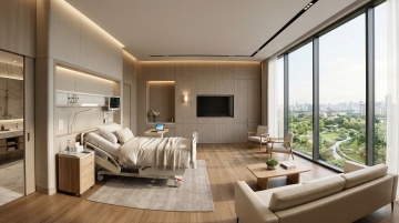 明亮的居家卧室,主色调为柔和的浅蓝色墙壁与米白色天花板,大窗户搭配米色与浅绿色渐变窗帘,窗外是城市远景,室内光线充足,自然光从左侧窗户洒入形成柔和阴影,中央摆放一张米色多功能病床,铺着洁白床单,床头配备医疗设备,病床旁有两张浅蓝色扶手椅和一张圆形小茶几,茶几上放置白色花瓶插着白色与淡粉色鲜花,地面为浅灰色防滑地板,整体氛围宁静、舒适、整洁,具有现代简约风格,细节质感清晰,光影过渡自然。
