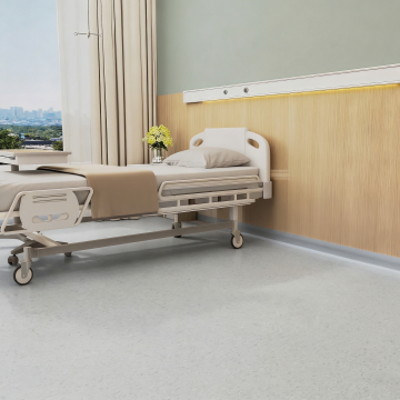 超写实风格医院走廊内部场景,明亮柔和的自然光与人工照明结合,天花板嵌入式筒灯与长条灯带提供均匀光线,地面为光滑反光的浅蓝色环氧地坪,墙壁采用浅蓝色与米白色渐变搭配,白色方形吊顶,走廊左侧为弧形护士站,配备电脑、文件架和绿色盆栽,右侧摆放医疗设备与座椅,整体色调以蓝白为主,营造干净、专业、宁静的医疗氛围,空间宽敞通透,景深效果明显,光影过渡自然,细节清晰,无LOGO、电话地址及二维码。