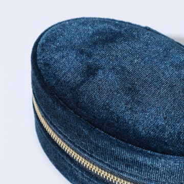 参考提供的图片,生成一款椭圆形韩国绒首饰收纳盒电商详情页图片,保持椭圆形款式一致,体现产品细腻丝绒材质、拉链细节质感和小巧便携的特点,产品放置在干净简洁浅色背景,高清商业摄影,清晰展示产品外观细节
