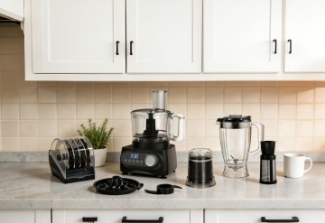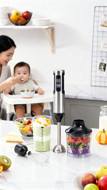 专业商业静物摄影,高清 8K,极致细节,自然光柔光,明亮干净通透,低饱和治愈色系,画面无杂物,色彩真实还原食物质感,对焦清晰,产品立体有光泽,氛围感温馨用心。场景为明亮简约的现代厨房,白色大理石台面搭配深灰色偏蓝的橱柜,台面上有白色微波炉、玻璃罐、砧板等,背景是带有百叶窗的窗户,窗外透入柔和自然光,营造清新干净的居家氛围。风格生活化、温馨,突出料理棒的日常实用性。主体不锈钢机身料理棒直立放置在台面中央,机身线条清晰,按键细节突出。配件围绕料理棒摆放:绞肉杯装着肉块,塑料果汁杯装着满满的草莓奶昔,上面有草莓点缀,打蛋器横放在画面右边,不要改变料理棒及配件的结构外观,配件内食材色彩鲜亮,直观展示多场景用途。台面左侧摆放盛有烤鸡块、西兰花、三文鱼、小番茄的餐盘;右侧放置装着牛奶的玻璃壶、盛有细腻糊状土豆泥的蓝边碗,以及装有草莓和蓝莓的碟子;台面角落散落彩色辅食模具,强化料理棒制作辅食、料理的场景感。侧光打亮产品主体,突出材质质感与杯内食材的新鲜度,背景虚化处理,让视觉焦点集中在料理棒及周边搭配上。整体以蓝、白、灰为主色调,搭配食材自然色彩,整体清新柔和,传递健康饮食理念,突出料理棒机身光滑质感、玻璃杯身通透感,料理棒底部与台面接触处有轻微反光,配件错落有致排列,形成视觉引导线,中心聚焦式构图,料理棒为视觉核心,配件环绕分布,背景元素虚化不抢镜,整体画面简洁有序,突出产品实用属性