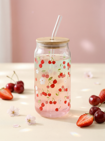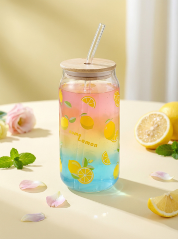 高硼硅透明玻璃可乐罐玻璃杯,杯身印满绿色西瓜图案,保持物理结构绝对不变,严禁扭曲。杯中装入马卡龙渐变色水果气泡水,通透高硼硅玻璃完全展示杯身印花。