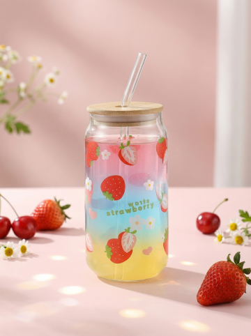 高硼硅透明玻璃可乐罐玻璃杯,杯身印满黄色柠檬图案,保持物理结构绝对不变,严禁扭曲。杯中装入马卡龙渐变色水果气泡水,通透高硼硅玻璃完全展示杯身印花。