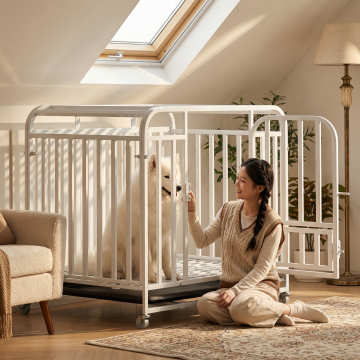 「图片1」产品是白色狗笼,生成4张不同场景图,场景要求家庭小清新氛围,狗笼里面坐着萨摩耶,一个美女在狗旁边逗狗玩,每张图片美女不同,图片比例1:1