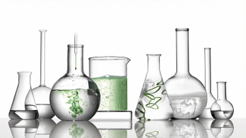 医疗科技感背景,蓝色与白色为主色调,柔和明亮的光线从上方照射,营造出洁净、专业且充满希望的氛围,画面中可见戴着白色乳胶手套的手正拿着装有黄色透明液体的玻璃试管,试管内液体有清晰的刻度,背景中隐约可见多个不同形态的玻璃器皿和实验设备,叠加着由六边形、线条、数据代码和分子结构组成的半透明科技感图形元素,整体呈现出高精度的3D渲染质感,光影过渡自然,细节丰富,构图以手部和试管为视觉焦点,背景元素层次分明,具有现代医疗实验室的视觉特征和科技感设计风格。