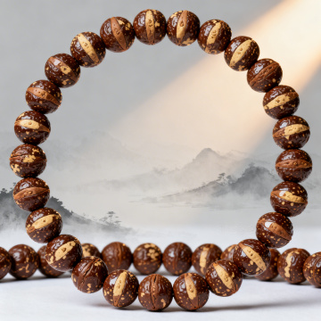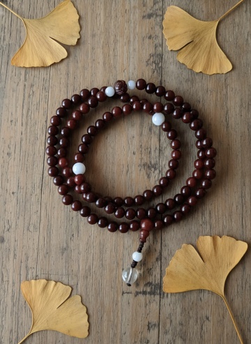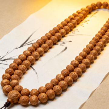中式禅意设计,实木肌理与木雕风佛珠交织,搭配银杏叶点缀,质朴静谧,自然气息浓厚,传递秋日宁静之美。