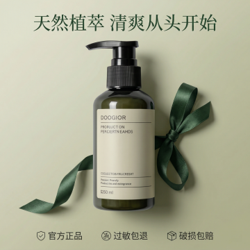洗发水海报设计,两瓶深绿色透明液体洗发水瓶,搭配黑色按压泵头和白色标签,标签上有黑色文字与金色装饰细节,瓶身优雅放置于浅棕色木质树枝上。树枝下方是清澈湿润的水面,点缀着光滑石头,周围环绕着鲜活的绿色植物枝叶与根茎。整体采用清新自然的绿色调,柔和的侧光照明营造出宁静、有机、纯净的氛围,背景为渐变浅绿色。画面视觉层次清晰,以产品为绝对主体,光影效果细腻,水面呈现清晰的瓶身倒影,整体质感写实,设计简约自然,传达出天然植物萃取的产品特性。