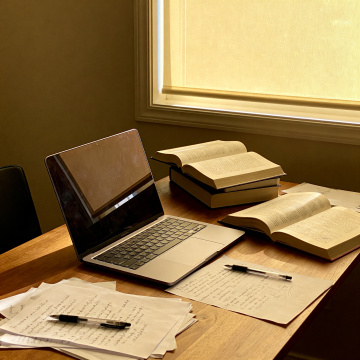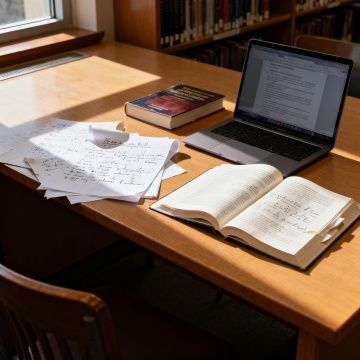 第一人称视角,图书馆靠窗学习桌面,桌面杂乱摆放笔记、打开的笔记本电脑和摊开书本,窗外自然光透入,真实自然写实摄影,无人,和参考图风格一致