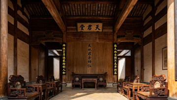 古典中式宗祠实景,木雕浮雕细节精致,光影交错间尽显静谧神圣之感。