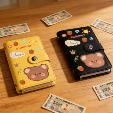 温馨且精致的桌面场景,金色金属网格收纳篮中整齐摆放着三本不同颜色的皮质笔记本,从左到右分别是淡紫色、明黄色和浅粉色,每本笔记本都配有白色蕾丝花边装饰的皮质绑带,绑带上有小巧的金色字母装饰。收纳篮放置在柔和的浅粉色桌面上,篮子左侧有一支粉色的笔斜放着,右侧有一个粉色的马卡龙点心。背景中有一个白色的小天使玩偶摆件,底座带有精致的花纹,旁边还有一个粉色的小熊形状便签夹,上面夹着一张写有“你最棒”字样的小卡片。整体画面采用柔和的暖色调光线,光影过渡自然,营造出温暖舒适、充满生活气息的氛围,色彩搭配清新甜美,细节丰富且质感细腻,具有明显的生活美学和温馨家居风格。