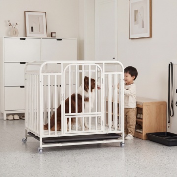 保持白色不锈钢狗笼物理结构绝对不变,狗笼放置在北欧风餐厅的浅灰色地砖上,狗笼里面坐着一只边牧犬,一个东亚面孔的小孩子站在狗笼旁边逗狗玩,整体氛围是家庭小清新风格,全屋漫射柔光,低对比度,阴影极淡柔和,画面明亮干净,色调为暖白低饱和度,营造温馨治愈感,背景是原木餐桌和白色餐边柜,餐桌上放着一瓶插着尤加利叶的玻璃花瓶,暖调自然光从餐厅窗照入,商业摄影,4K超清,通透干净。